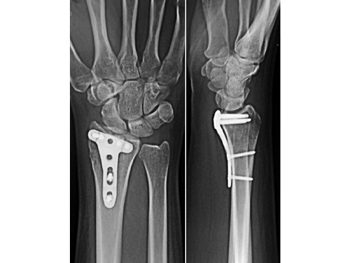 The Locking Distal Radius System 2.4 consists of the new plates: LCP T-Plate 2.4, LCP Radial Column Plate 2.4, LCP L-Plate 2.4, LCP Distal Radius Plate 2.4, dorsal (p-Plate), LCP Volar Plate 2.4, and LCP Volar Buttress Plate 2.4. The 2.4 mm Locking Head Screw, self-tapping, the 2.4 mm Cortex Screw, self-tappingboth with Stardrive recessand special instruments complete the new system. This variety of plates allows fragment-specific treatment of all patterns of distal radial fractures. Indications are simple and displaced extraarticular and intraarticular distal radial fractures and corrective osteotomies of the distal radius. All implants are manufactured in Ti15Mo resulting in excellent bending properties and resistance to fatigue failure, allowing reverse bending. The edges of all plates are chamfered to reduce sharp edges that could contribute to irritation of tendons. Surfaces are polished to minimize tissue adhesion. The distal arms provide a smooth gliding surface for the tendons. Different plate lengths are offered to avoid cutting. The angular stability of the construct allows treatment of osteoporotic bone.