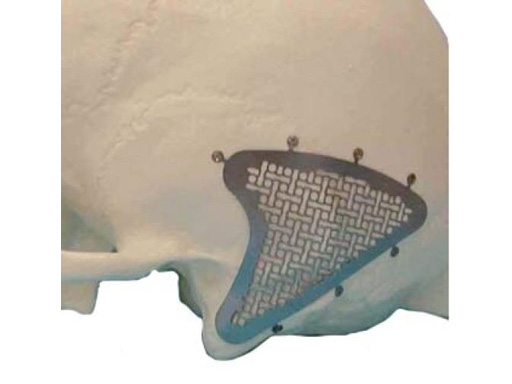 The Low Profile Neuro System has been enhanced by a medium sized mesh for the mastoid. This mesh is a triangular shaped piece of contourable mesh with ears allowing fixation in the mastoid region of the skull. Due to the contours found in the mastoid area, this malleable, triangular shape is advantageous for procedures where the bone is osteotomized. It can also be used as a crib to assist in reconstruction of the mastoid area using bone substitutes.