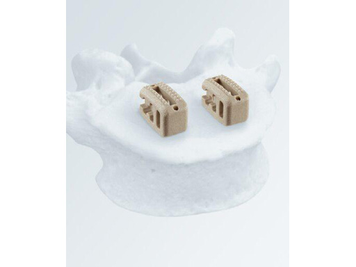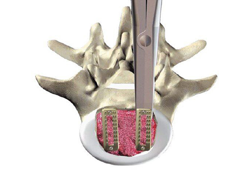 For the surgical treatment of degenerated lumbar discs, cages can be used in order to restore disc height and the lordotic curve. A mechanically stable and durable device such as PLIVIOS or Contact Fusion Cage can be used. The new PLIVIOS implants are based on the clinically established PLIVIOS and Vertebral Spacer-PR concept. The open structure and the interface to the implant holder is the same. In order to ease the rotation of the implant, one row of teeth has been removed and is replaced by a chamfer. The cross-section is adapted to the Contact Fusion Cage sizes of 7 8 mm, 9 8 mm, 10 8 mm, 11 9 mm, 12 10 mm, 13 10 mm, and 15 11 mm. The implants provide two lordotic angles of 4 and 8. All implants are available empty or prefilled with chronOS block material. PLIVIOS provides benefits in dorsal arthrodesis with cage by preserving the integrity of the endplates and their stability.