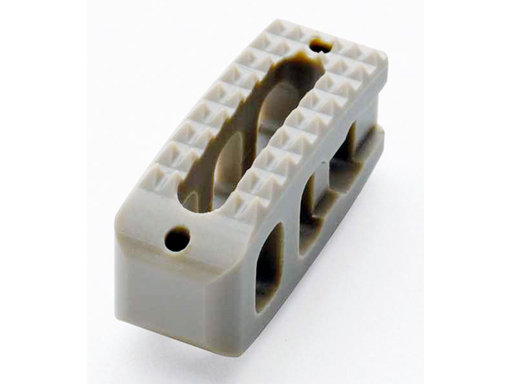 The spacer is made out of PEEK Optima, a radiolucent, biocompatible, inert polymer material. It has a rectangular footprint and convex cranial/caudal surfaces to match the vertebral endplate geometry. The implant has a scaffold-like structure which reduces the overall amount of synthetic material needed. A central hole allows the use of allograft. The Vertebral Spacer PR contains two radio-opaque pins for proper placement under fluoroscopy and recognition in follow-up evaluations.