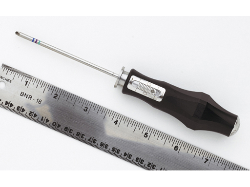 The new Ratcheting Screwdriver for manual insertion and placement of Synthes 2.0 mm, 2.4 mm, and 3.0 mm maxillofacial screws features a more ergonomic handle made of standard medical grade phenolic and stainless steel. The screwdriver has three operation positions - forward ratchet, reverse ratchet, and locked. It takes maxillofacial hex coupling blades/tapes.