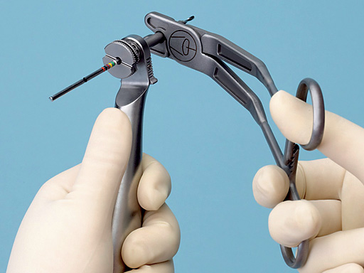 The Basic Trocar Handle can rotate around the cannula to allow for more space at the operating site. To maintain control over the instrument, the handle engages like a ratchet in discrete arcs instead of freely rotating.