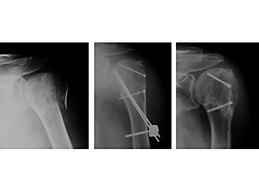 Follow-up assessment was carried out in 14 of the 16 cases. In 13 cases fracture consolidation was described by the treating physician; in one case delayed healing was suspected. Slight impaction was observed in four cases and more severe impaction in two cases. Impaction can be regarded as a desirable event. In relation to the implant, the K-wires act as a sort of splint so that impaction occurs in a controlled manner. Dislocation of the humeral head was not observed in any case. In 11 patients, the K-wires perforated the articular surface; this occurred 6 times intraoperatively and 5 times postoperatively. Primary and secondary perforation of the K-wires through the articular surface indicates that the K-wires need to be placed in the immediate subchondral region in porotic bone if they are to find sufficient anchorage. Therefore, implant removal after fracture healing or prior to mobilization is necessary; the surgeon may possibly have to withdraw some of the K-wires slightly early on. The following complications occurred during the healing process: local wound irritation above the implant (2 cases; due to incorrectly clipped K-wires) and skin perforation by a K-wire (1 case). In one case, reduction of the greater tubercle was lost in a 4-fragment fracture; reoperation to stabilize the fragment was necessary. There was probably delayed union in one case of a 76-year-old patient. Infections and / or nerve lesions were not observed in any case.