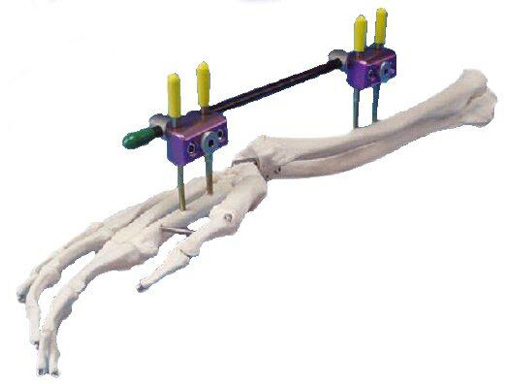 The low profile distal radius fixator is similar to the distal radius fixator (DRF) in function, but is simpler in design and has a lower profile. The low profile distal radius fixator is a 6 mm carbon fiber rod system, as compared to the 8 mm carbon fiber rod system of the DRF. The low profile distal radius fixator is offered in sterile packaged kits including all of the necessary hardware and instrumentation. There are two different options of Schanz screws, 4.0 mm/2.5 mm trocar tip and 4.0 mm/3.0 mm self-drilling. Two different length options of carbon fiber rods, 200 mm and 220 mm, are available. The low profile distal radius fixator comes preassembled in the package.