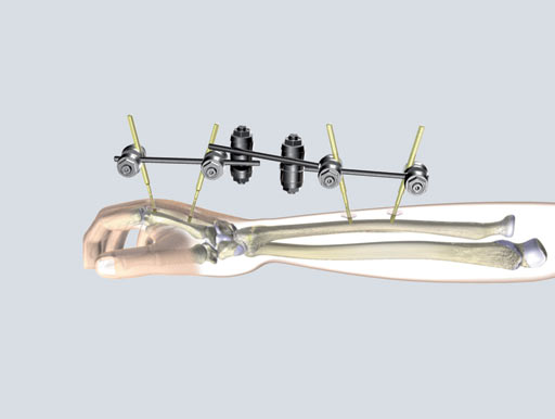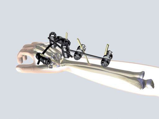 The Radiolucent Small External Fixator is indicated for unstable fractures of the distal radius (intra- and extraarticular, as well as fractures with open and closed soft-tissue defect), injuries, fractures, dislocations, and burns in the wrist and forearm, fractures in connection with extensive soft-tissue injuries, bone loss and vessel and/or nerve involvement, fracture dislocations of the wrist, and in open pediatric fractures with bone loss.