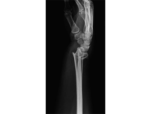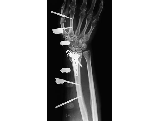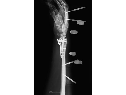External fixator due to severe soft-tissue trauma. Palmar plate 1 week later. .