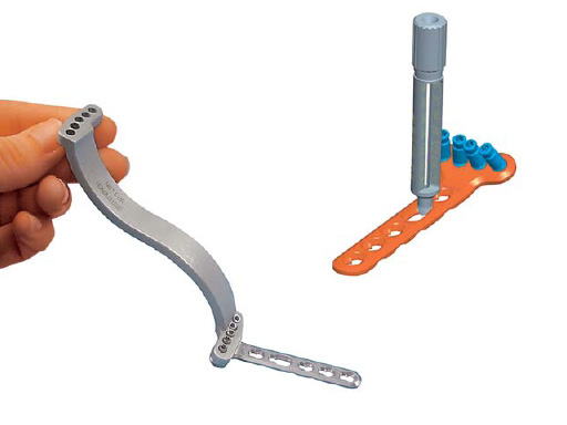 The short 1.8 mm threaded drill guide and insertion handles are instruments for use with the LCP Extraarticular Volar Distal Radius Plate, 4- and 6-hole versions.