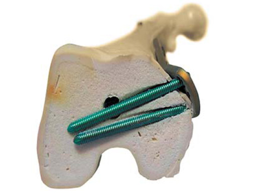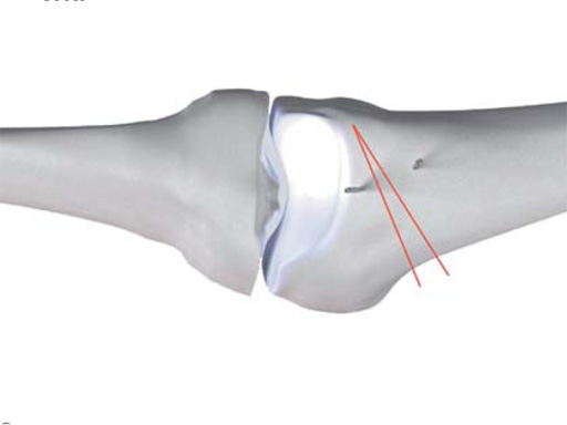 An anteromedial skin incision is used. This skin incision can be reused and expanded during subsequent knee surgery. The vastus medialis muscle is dissected from the septum, the medial patellofemoral ligament (MPFL) and the distal insertion of the vastus medialis muscle are partially incised. Two blunt Hohmann retractors are placed around the distal femur. The oblique osteotomy starts in the medial supracondylar area and ends in the lateral condyle, approximately 10 mm inside the lateral cortex. For guiding the closing wedge osteotomy of the distal femur a specific saw guide will be available soon. Alternatively, it is possible to use K-wires inserted under image intensifier control to mark the bone cuts. The saw cuts are made with retractors protecting the soft tissue and vessels. The wedge is removed and the height and depth of the osteotomy can be measured. At this time it is possible to make modifications concerning the wedge size. Closing the wedge must be done gradually by gentle compression of the lower leg laterally, and stabilizing the knee joint medially near the area of osteotomy. This may take several minutes to enable plastic deformation of the lateral cortex to close the osteotomy gap. Leg alignment is checked radiologically after closing with a rigid alignment bar positioned between hip and ankle center. The bar representing the weight-bearing line should pass the preoperatively defined mechanical axis. The plate is inserted from distal under the vastus medialis muscle. The distal drill holes are oriented in a 20 angle inclination on the frontal plane to avoid a posterior perforation of locking head screws in the distal femur. The distal four bolts are placed. A lag screw is positioned in the dynamic hole directly above the osteotomy for compression of the osteotomy site. The screw should be tightened carefully using the image intensifier. The plate is now fixed to the shaft with bolts monocortically, and the lag screw is replaced by a bolt bicortically. The wound is closed in layers after insertion of a drain. The patient is mobilized on the first day after surgery. Partial weight bearing is recommended for 6 weeks, active movement of the knee is enhanced. Biomechanical testing confirmed superior stability of medial closing wedge techniques as compared to lateral open wedge techniques and favourable axial and torsional loading characteristics of the TomoFix medial distal femur (MDF) plate. The plate is now available, as well as a booklet on the operative technique.