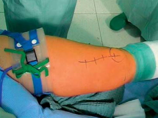 The plate is inserted distally under the vastus medial muscle after screwing the threaded LCP drill guides into the four distal plate holes using the guiding block. The distal drill holes are oriented in a 20 angle inclination on the frontal plane to avoid a posterior perforation of locking head screws in the distal femur.