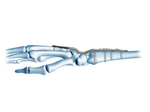 The LCP wrist fusion system offers three different plates: a standard bend plate, a short bend plate, and a straight plate. The correct plate is selected according to the condition of the soft tissues and the boney anatomy of the patient's wrist. The standard bend plate is used for radiometacarpal fixation of average-sized individuals. The short bend plate is used for wrist fixation in small-stature individuals and for fusion following proximal row carpectomy. The straight plate is used for wrist fixation when the standard and short bend plates do not fit the anatomy.
