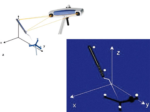 The most basic imaging for spinal surgery consists of static AP and lateral x-rays or image intensification during surgery. In CAS a virtual representation of the surgeons instruments are shown in relation to the patients anatomy that is displayed on a separate computer screen. CT scans or image intensifier images are used to generate the virtual surgical reality. This surgical GPS requires the attachment of a reference array with reflective beads to the patients spinal anatomy and to the surgical instrument to be tracked. The 2-D information obtained by two infrared cameras tracking these beads is converted into a 3-D representation based on the different reflective angles (Fig 1). Tracking using electromagnetic instead of infrared technology is currently being evaluated and has shown promising results [6, 7].