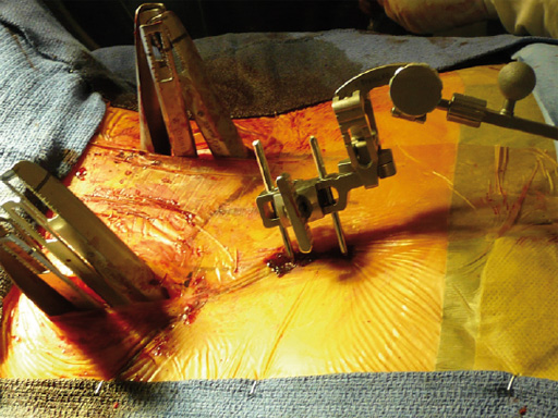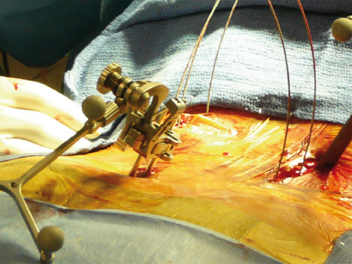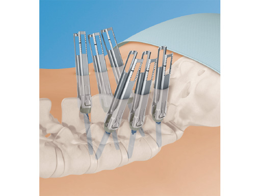 This system uses cannulated pedicle screws attached to screw-mounted tissue retractors. This combination allows pedicle screw insertion and rod introduction with minimal tissue disruption. The system is applicable to single and multi-level procedures requiring posterior instrumentation.