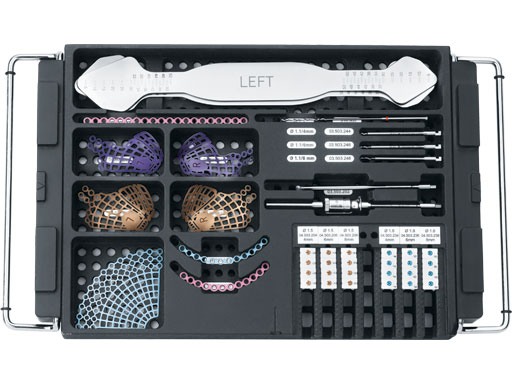 Based on the matrix midface system, it is a dedicated set with implants and instruments specifically designed intended for orbital reconstruction. It includes a variety of existing implants, such as the orbital floor mesh plates in two versions (0.3 mm and 0.4 mm in thickness) as well as the curved 12-hole orbital plate, and the straight adaption plate with 20 holes. All implants match the sizes and hence the color coding of the matrix midface system being available in 0.5 mm (blue), 0.7 mm (pink) versions.