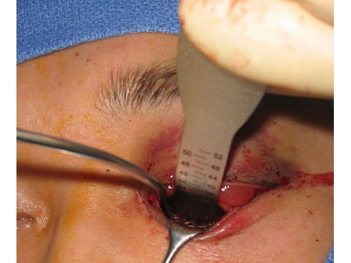Unlike the existing 2-D mesh implants, the geometry of the new preformed plates will be adequate to match the individual anatomical situation of the patient in almost any case. However, the mesh parts can be individually adjusted if necessary. In these cases the solid part in the central posterior area needs to remain untouched. Areas of the orbit that do not require a bridging can be spared out by trimming the implant along the designated cutting lines in the height of the medial wall and/or length of the orbital floor area. The lateral anterior part of the plate is intentionally prebent higher than the orbital rim anatomy to allow free plate movement during plate positioning.