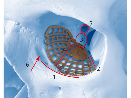 Fig 3 Implant placement according to the orbital landmarks: 1 Orbital rim, 2 Inferior orbital fissure, 3 Posterior orbital ledge, 4 Transition between the medial wall and orbital floor, 5 Optic canal, 6 Lacrimal fossa.