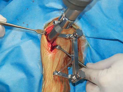 The Mini TPLO Jig features a 45 degree jig pin screw orientation for more access to plate head holes. Further, it attaches to the bone with K-wires of 1.6 mm to 2.5 mm diameter to accommodate the great variety of patient size. The jig arms can be angled as needed to position the jig pins optimally in the proximal and distal aspect of the tibia. During sawing, the surgeon will appreciate the vibration resistant hinge screw (Fig 2). In the past, a loss of hinge screws during the osteotomy procedure has led to dissatisfaction.