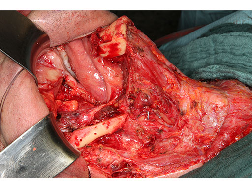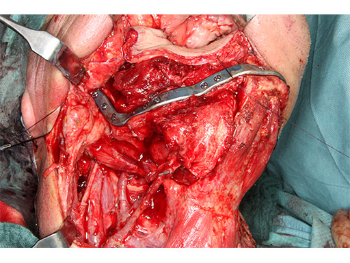 The bony surface of the mandible is covered with a tumor infiltrated soft envelope. The SLS resection guides are screw-fixated in place.