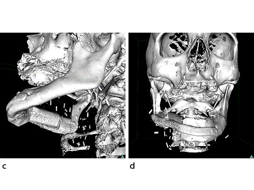 Mandibular defects can be the consequence of segmental resection of the mandible due to malign/benign tumors, maxillofacial trauma caused by ballistic or avulsion injuries, multifragmentation, and end stage osteoradionecrosis (ORN). Reconstruction of the mandible is indicated for functional restoration, psychological recovery, and social reintegration of patients suffering from such defect conditions. In large wide-spanning defects covering more than the extent of a hemimandible, it is a first-line goal to rebuild the bone continuity along the base of the mandible. In smaller defects, a "functional" reconstruction of the former dentoalveoalar process is paramount to carrying dental implants in the future. Whenever possible, in determining the suitability and length of a bone or bone-containing flap, both the supporting mandibular infrastructure as well as a neoridge should be reconstructed to recreate an ideal intermaxillary relationship with a matching bed to achieve a dental implant-based functional prosthodontic rehabilitation and optimal facial esthetics. Patient specific plates can help to achieve this reconstruction (Fig 1a).