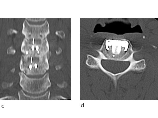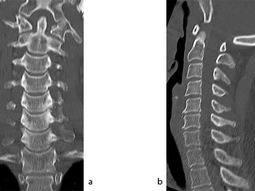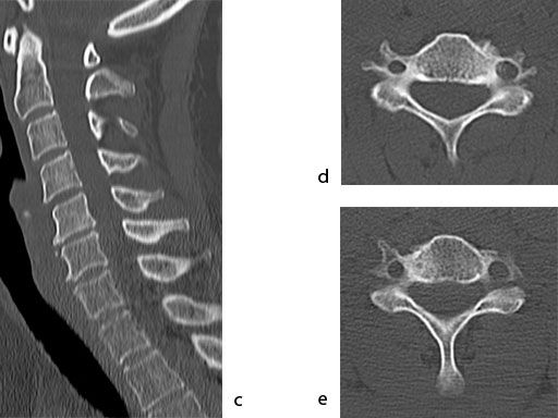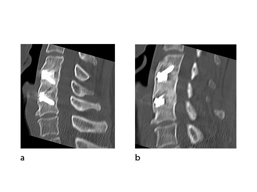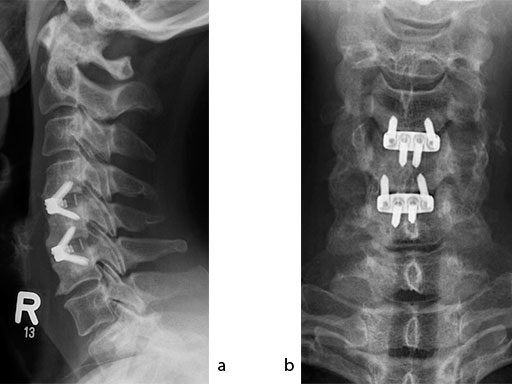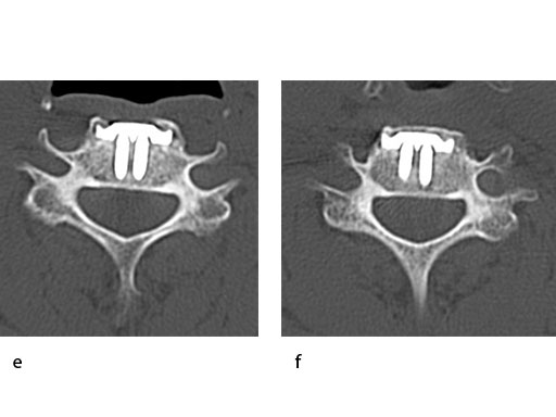 A 51-year-old woman was affected by cervical radiculo-myelopathy due to spinal and neuroforaminal stenosis. The preoperative CT scans are shown at Fig 4 and MRI at Fig 5.