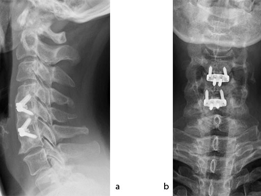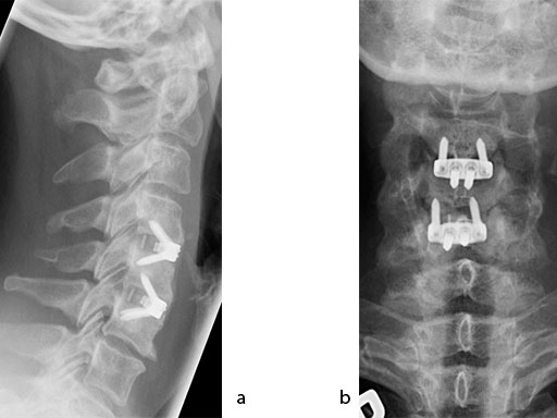 The patient was treated by anterior cervical decompression and fusion (ACDF) with ZERO-P filled with ChronOS. No autologous bone graft was used. Postoperative images are shown (Fig 69).