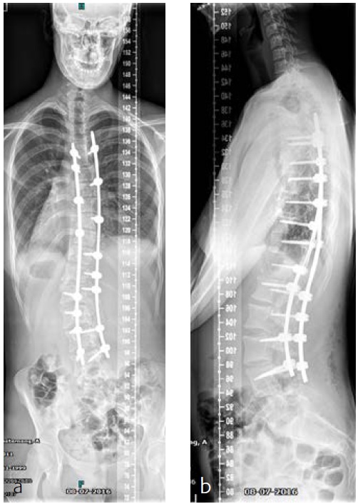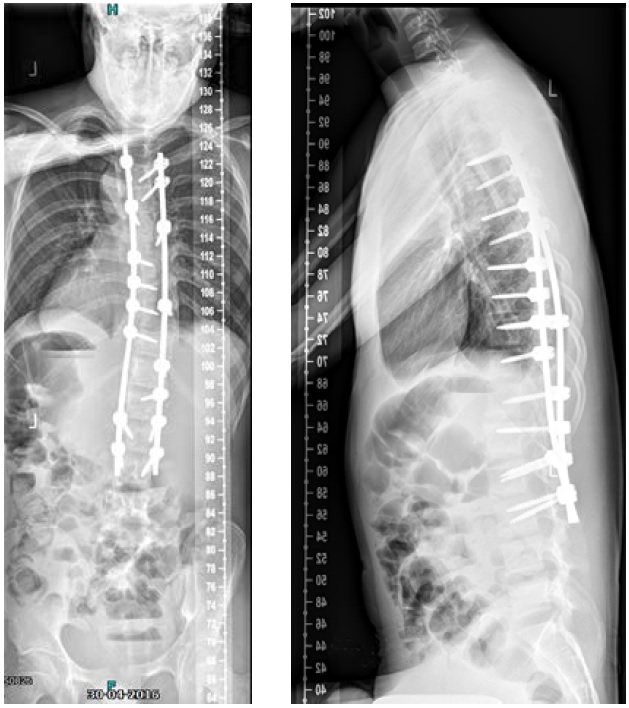 After her visit to our clinic, she was planned for surgical correction of the deformity from T5L4 (Fig 11). Surgical procedure with IONM (TC-MEP) postoperative epidural analgesia with the catheter tip at T8. She was mobilised the first postoperative day (Fig 12) and discharged the fourth day after surgery. The patient returned for her 6-month follow-up without any complaints. Limitations are in line with our advice (no sports for 6 months postoperatively). She has no pain and uses no medication.