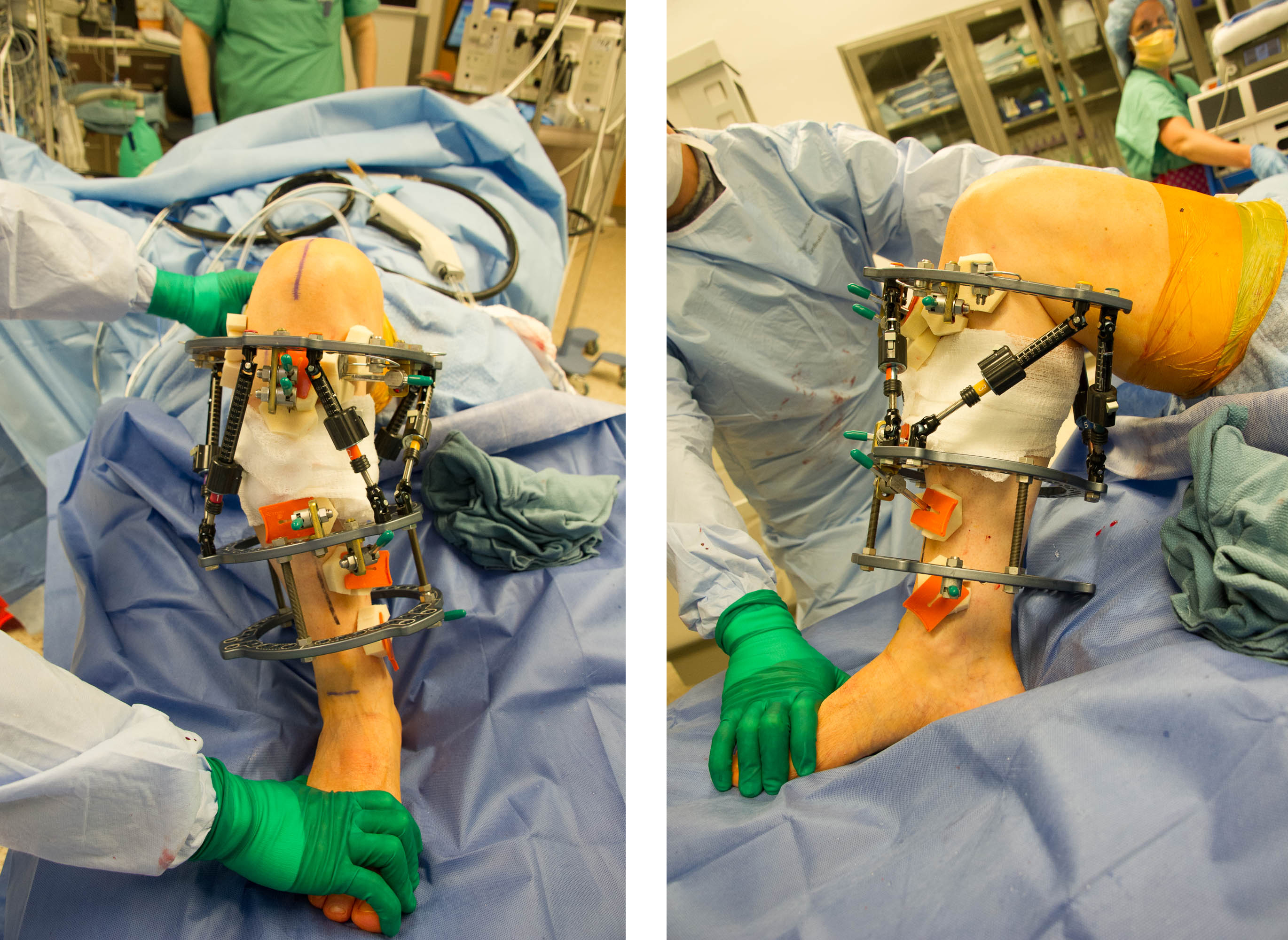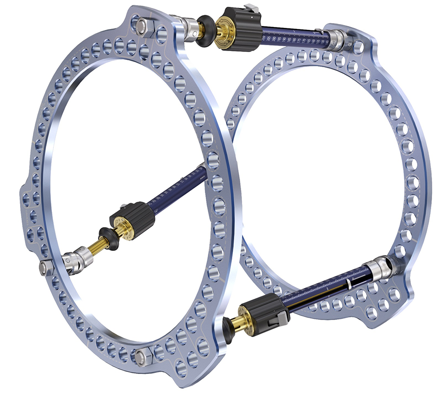 The original MAXFRAME Hardware is a hexapod consisting of two rings and six struts. New linear versions of the latter with variable joints enable intraoperative alterations to the frame configuration without risking construct instability (Fig 8). Before the new linear struts, hardware from the Distraction Osteogenesis (DO) Ring System was required to enable strut exchange.