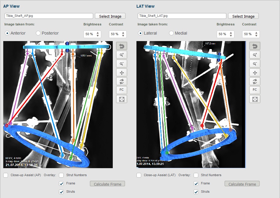 A 3-D reconstruction of a clinical situation is commonly used in navigation. One of the prerequisites for 3-D reconstruction based on two x-rays is the matching of characteristic landmarks or markers of a known body. The perfectly known body in a MAXFRAME is the frame construct itself. As we are already aware, the geometry of a MAXFRAME is perfectly defined through specific placement of rings and struts. The perspective frame matching method workflow uses this defined frame geometry to produce a perfect 3-D reconstruction of the clinical situation in the individual case. The struts as seen in the x-ray images are matched by their joints and/or axis and the 3-D reconstruction is calculated based on this matching on both images. The images do not need to be rectangular or perfectly shot along the axis. The only prerequisite is that all struts, preferably with the joints, are visible in both x-ray images (Fig 3).