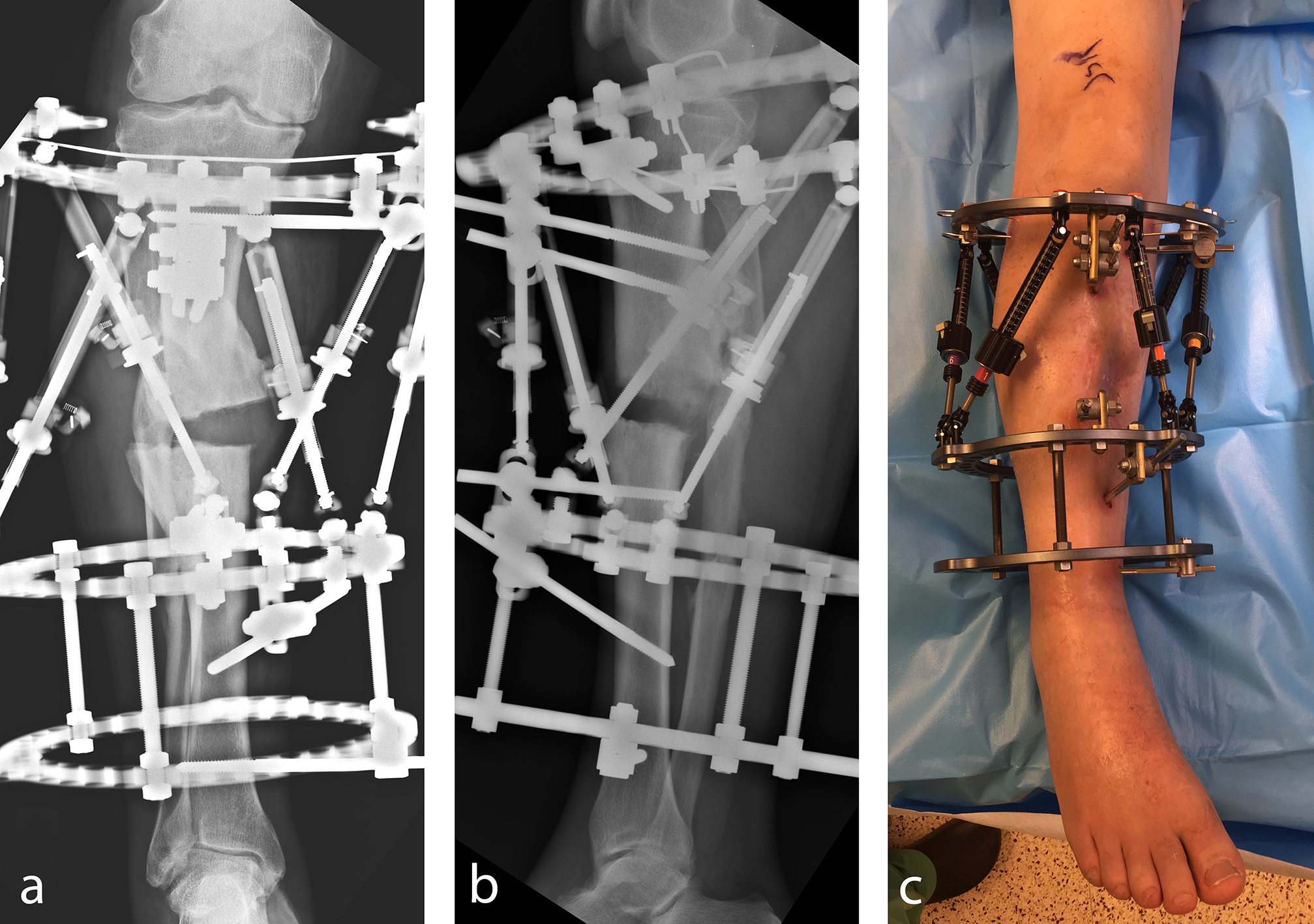 There are several options for adjusting the length of the linear struts depending on surgeon preference. At the end of a patient’s deformity correction with the MAXFRAME, it is possible to opt for definitive treatment using the MAXFRAME rather than potentially resorting to open reduction and internal fixation. Traditional MAXFRAME struts can be exchanged for a lesser number of linear struts and provide a stable construct for final healing.
