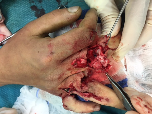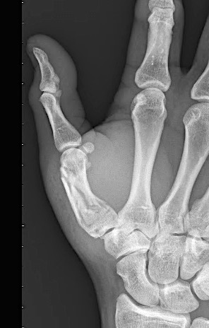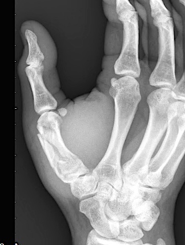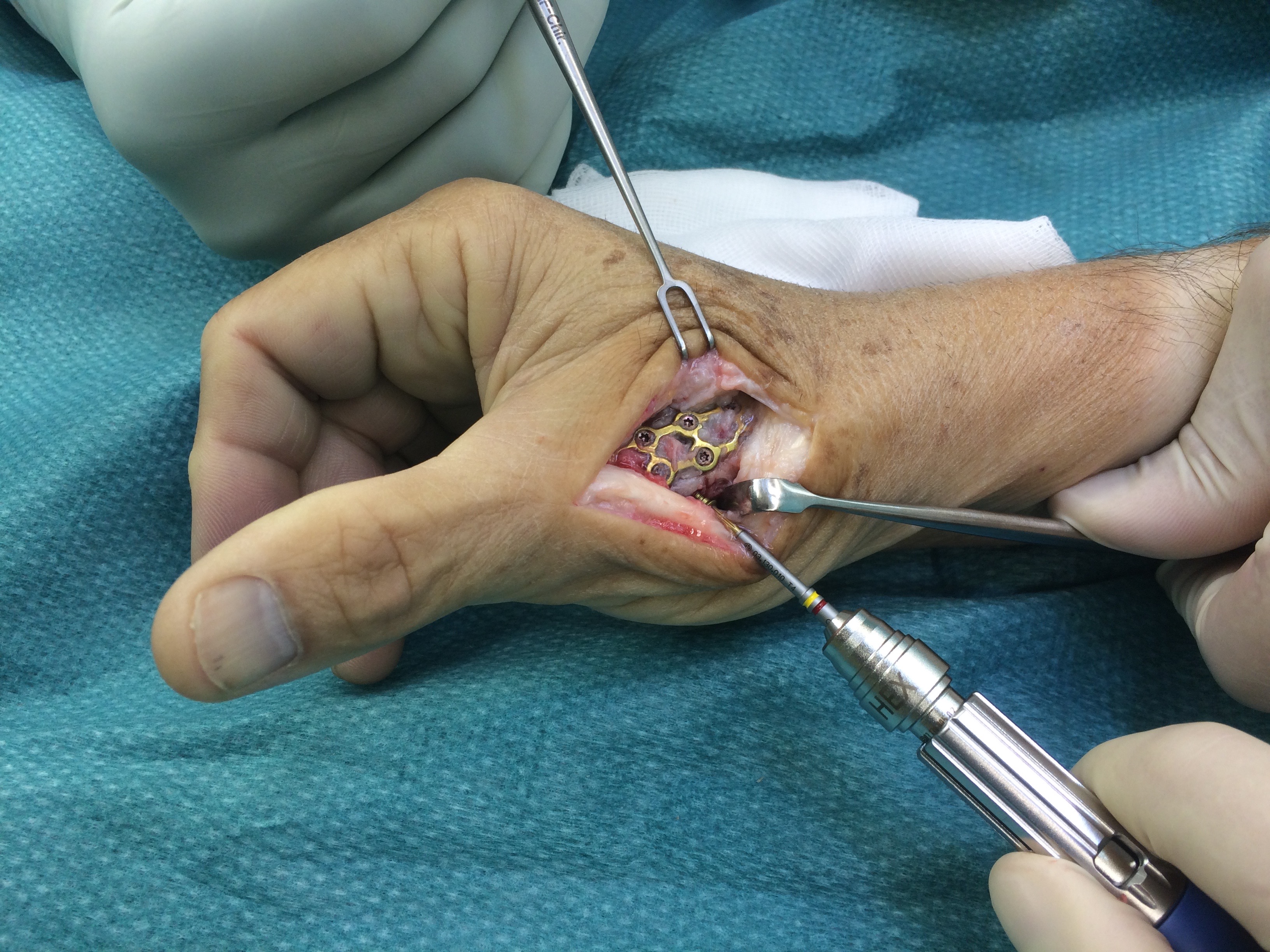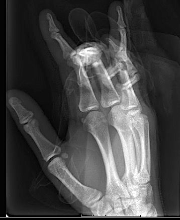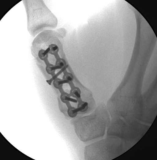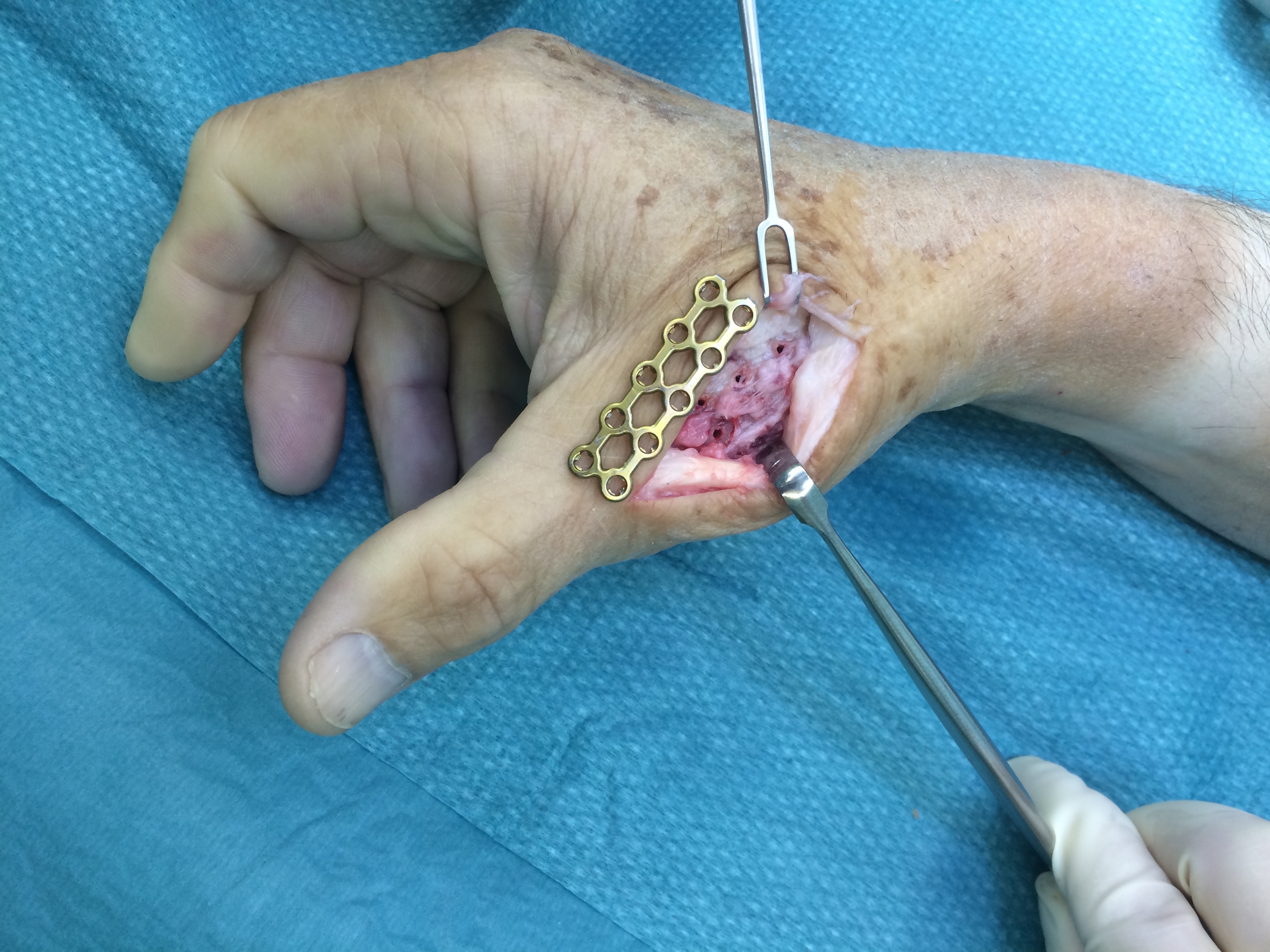A 64-year-old male suffered a multi-fragmentary fracture of his right thumb metacarpal (Fig 1). An adapted 12-hole strut plate from the variable angle locking hand system was the implant of choice for fixation (Figs 2 - 4).