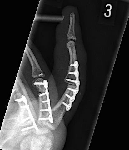 A 20-year-old male suffered a complex multi-digit injury of the right hand requiring revascularization and stabilization of both proximal phalanx and PIP joint fractures (Figs 5 - 8). Multiple plates, including the rotation correction plate from the 1.5 module of the VA Locking Hand System were used for fixation. The Variable Angle Locking system is ideal when only two screws, either proximal or distal, are able to be inserted due to space limitation.