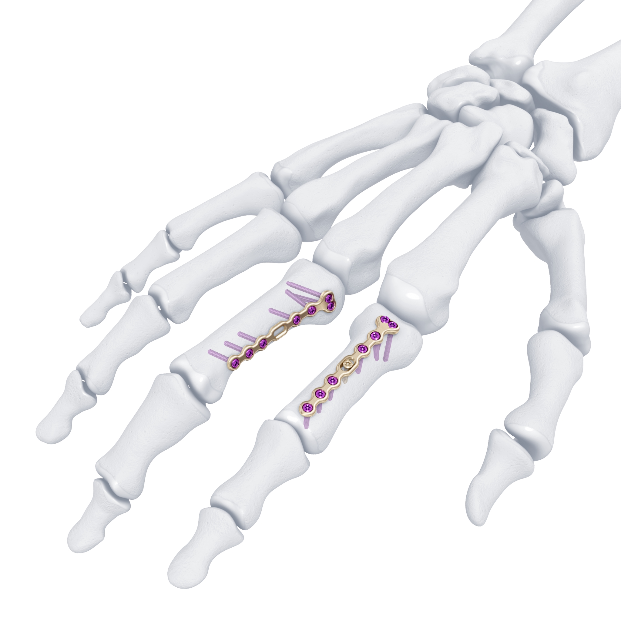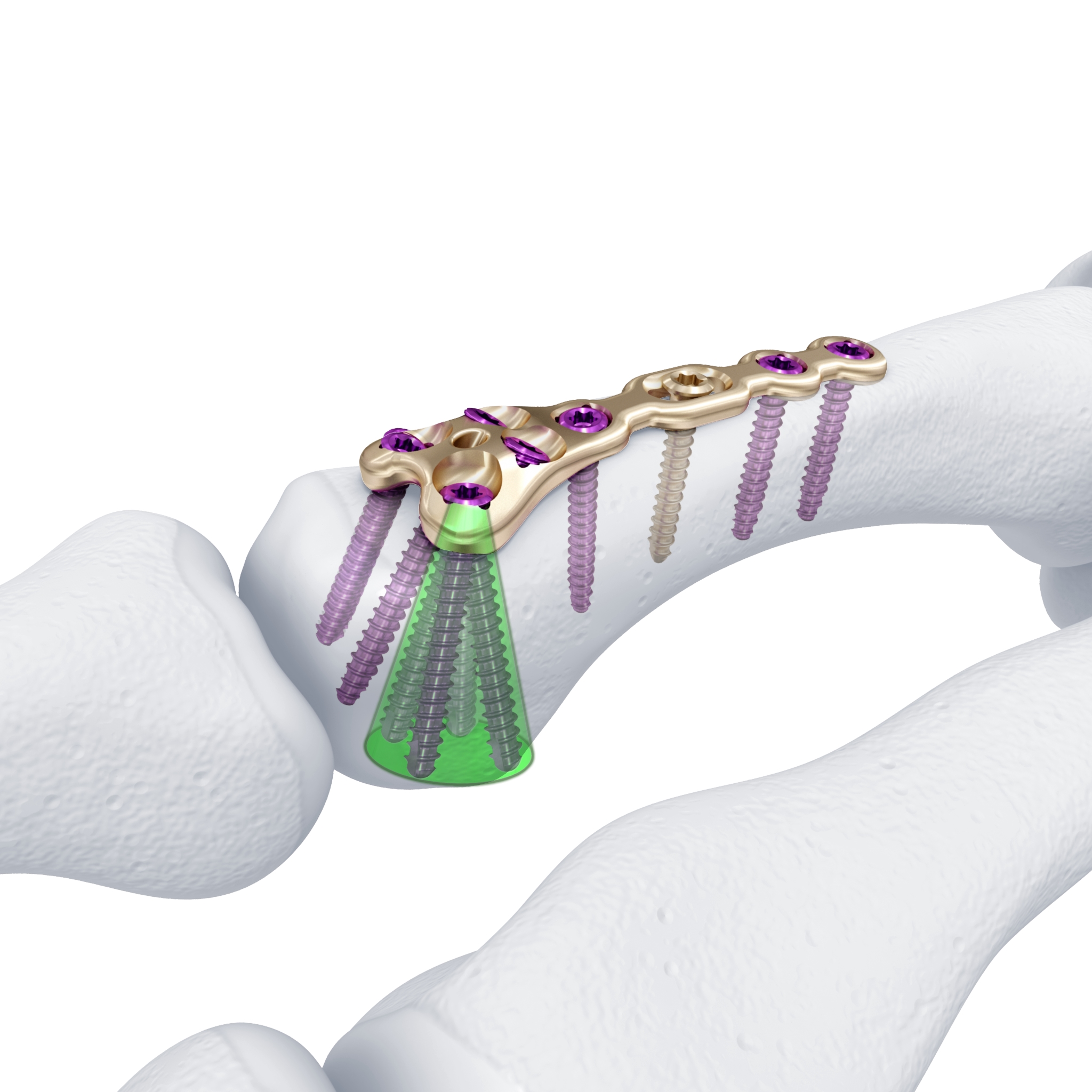 For reconstruction applications, a variety of implants that provide precise rotational adjustment have been added. Small rotational deformities of the digits are common and have a greater functional impact than other long bone deformities. These implants provide fine adjustment capabilities. Integration of variable angle locking technology (VA-LCP) into the 1.5 mm and 2.0 mm systems allow for improved placement of screws in metaphyseal bone. Safer and more accurate screw placement in periarticular and juxta-articular positions is realized with the VA-LCP (Fig 3).