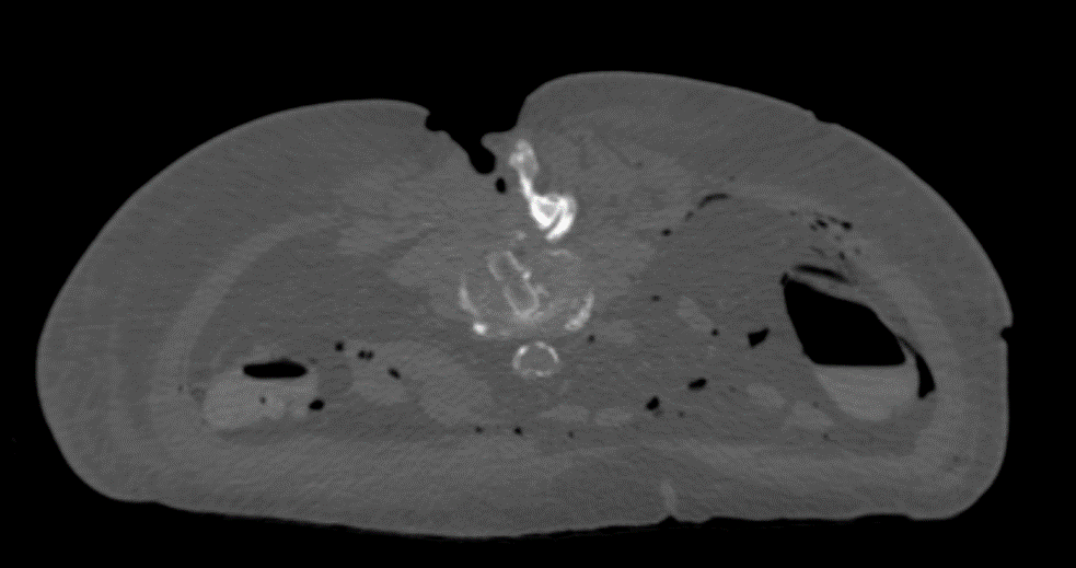 The PEEK core of the PROTI 360° cage has favorable imaging characteristics which support the postoperative assessment of fusion, while the titanium outer layer allows measurement of cage positioning. Clinically, depending on the image quality, plane of view, and patient anatomy, the PROTI 360° cage may show a ghost image of the entire cage on fluoroscopic images (Fig 7). CT images show minimal scatter around the implant (Fig 8).