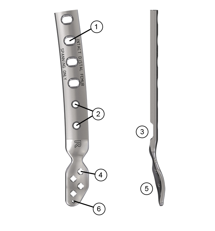 The modular system consists of anatomically pre-shaped plates with variable angle locking screw technology. The versatility of the system allows the surgeon to connect the plate components in various configurations in response to different fracture patterns. The number of plate holes and their location were chosen to facilitate high fixation density around an intramedullary implant. The distal spanning attachment plate is intended to prevent fractures of the intact distal femur rather than span a fracture. It is designed to avoid abrupt stiffness changes in the fixation construct by distributing the load among multiple fixation points in the lateral femoral condyle.