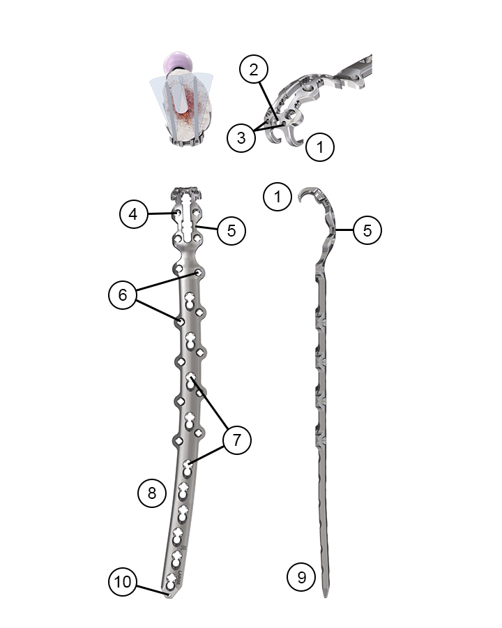 (10) Distal plate tip with wire hole and slot for Articulated Tension Device.