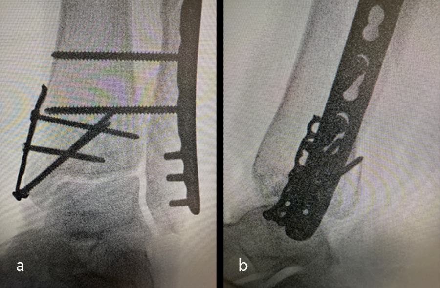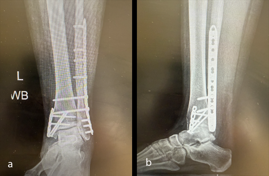 At subsequent follow-up visits, the patient was doing well with full weight bearing and normal gait. The treatment plan is to remove the syndesmosis screws at 6 months postoperative or when convenient for the patient. As the screws are 4.0 mm, they are less likely to break. However, should screw breakage occur, the evidence [1] shows there is no disadvantage if they are removed from medial and lateral aspects of the ankle, or if the screw fragments are left in place.