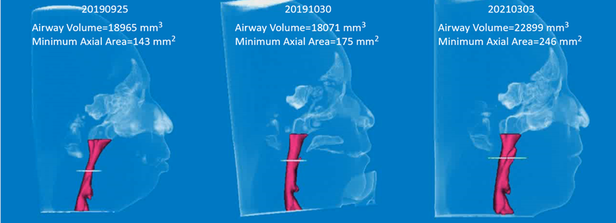 A patient with small chin complaining of sleeping disturbance with snoring, and pre-op AHI: 8.5 was noted (Fig. 2a) underwent segmental Le Lefort I osteotomy with maxilla-mandibular advancement (Fig. 2b). Post-operative airway expansion has been achieved with reduction of AHI (AHI: 2.4) after orthognathic surgery. Three-dimensional airway change shows volume of pharyngeal airway has enlarged from 18965 mm3 to 22899 mm3 peri-operatively (Fig. 2c). The patient was happy with functional and esthetical improvement during the whole treatment. Similar study of airway change could be searched in the literature which addressed patients with cleft receiving orthognathic surgery5.