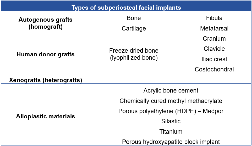 When considering the type of subperiosteal implant, autogenous grafts, human donor grafts, xenografts or alloplastic materials may be used (Table 1). Often bone or cartilage is harvested from the patients themselves, but an alternative is to use a human donor graft such as freeze dried or lyophilized bone. Xenografts and alloplastic materials also have their place in reconstructive surgery, the latter of which is the focus of this article.