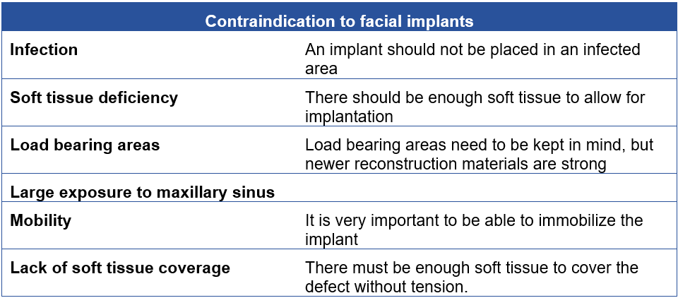 When considering implants for facial reconstruction, the ideal implant should fulfil several criteria. They should be readily available and affordable, sterilizable, strong, inert, non-allergenic, durable, non-carcinogenic, be easily manipulated and shaped, and suitable for single-stage reconstruction. There are also several contraindications to facial implants (Table 2), such as infection or soft tissue deficiency. Regarding load bearing areas, this is no longer such a problem, because of the rigid fixation and materials used.