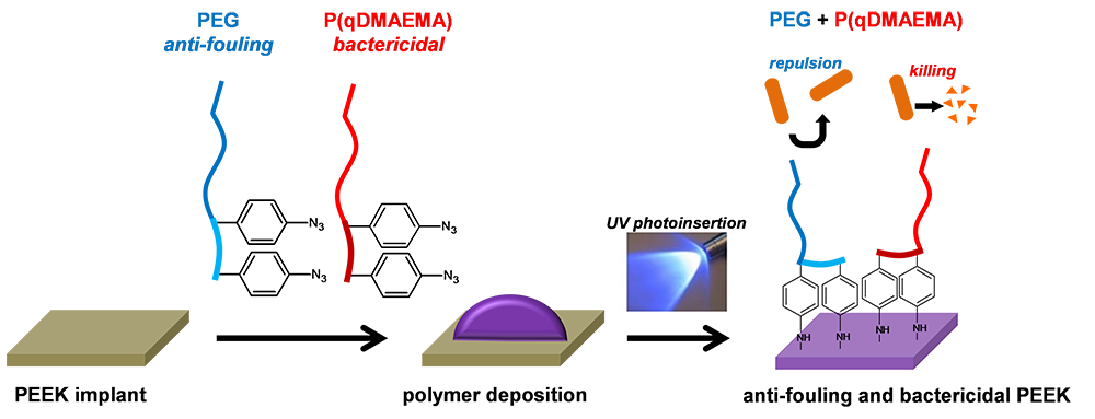 We propose to develop a one-step chemical functionalization which can be applied to any preformed or commercial PEEK PSI that will bring long-term antibacterial protection. By using two different bioactive polymers, we confer to PEEK implants antifouling and bactericide activity. We hypothesize that by combining both approaches in one single coating, we will not only decrease the surface propensity to be colonized by bacteria, but it will actively kill them and clear debris away from the surface of the implant. -