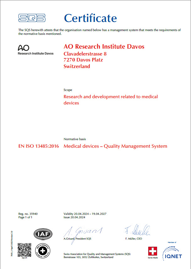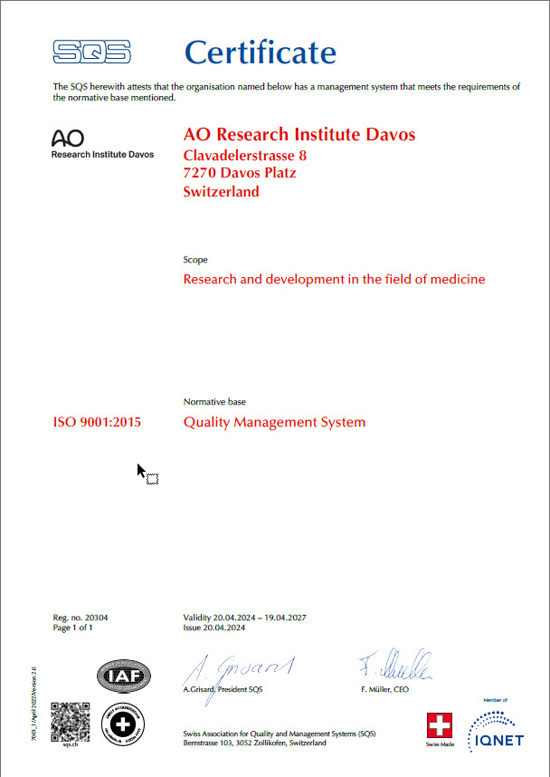 The entire AO Research Institute Davos (ARI) is certified according to ISO 9001:2015 and we have good reason to be proud of this. AO Research Institute Davos is one of very few academic research organizations to have achieved this certification.