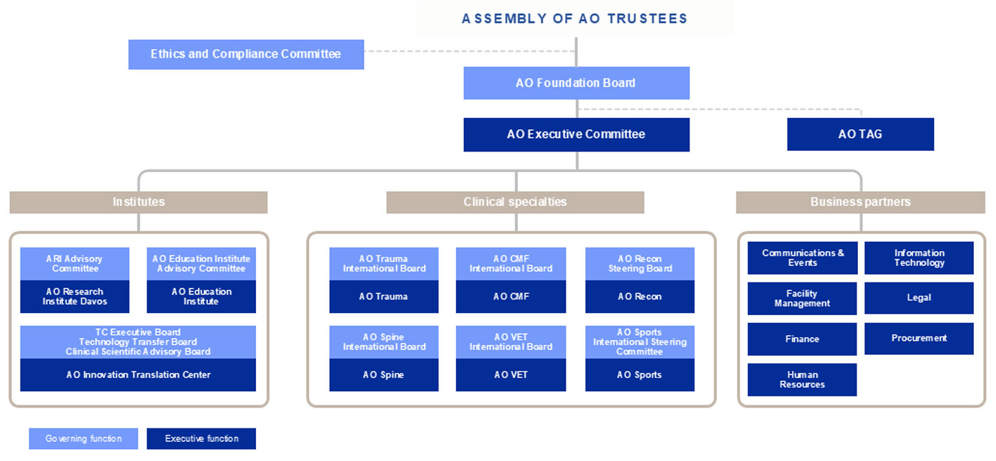 The AO's structure mirrors its functional areas. The AO's institutes and clinical specialties are responsible for education, research, development, innovation, clinical investigation, and approval of new devices or methods. The management boards support and supervise the implementation of AO activities.