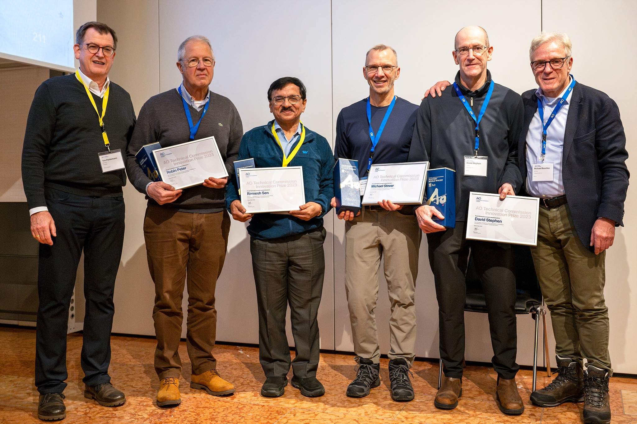 AO Technical Commission award ceremony for the 2023 Innovation Prize. From left: AO President Tim Pohlemann, PEEG members Robin Peter, Ramesh Sen, Michael Stover (Chairperson), David Stephen, Chairperson AO TC Trauma Michael Raschke.