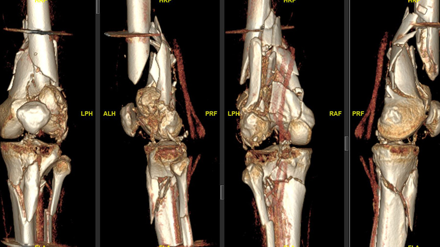 “The patient was driving a car while on holidays in Mexico and was hit from the left side. He had serial rib fractures, a nasty, open fracture of his left elbow, and an open, complex floating knee injury, a comminuted distal femoral fracture, and a proximal tibial fracture on the left side as well as a proximal tibial fracture on the other side,” Sommer explains, noting that after about two weeks of care in Mexico, the patient was flown back to Switzerland by Rega Swiss Air-Rescue. “He arrived at our hospital with an external fixator on his left knee and elbow, and was in generally good shape. First, my colleague fixed his elbow and right tibia; and, unfortunately, the patient had also an injury to his left radial nerve that had to be reconstructed.”