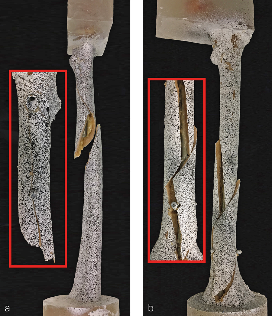 Each specimen was first biomechanically preloaded at 1 Hz over 2000 cycles in superimposed synchronous axial compression to 1800 N and internal rotation to 11.5 Nm (Fig 1). Next, internal rotation to failure was applied over an arc of 90° within 1 second under 700 N axial load. Torsional stiffness as well as torque, angle, and energy at failure were evaluated. Digital image correlation analysis was performed by means of stereographic optical measurements using a contactless full-field deformation technology to calculate the strain at the fracture site. Fracture patterns were analyzed.