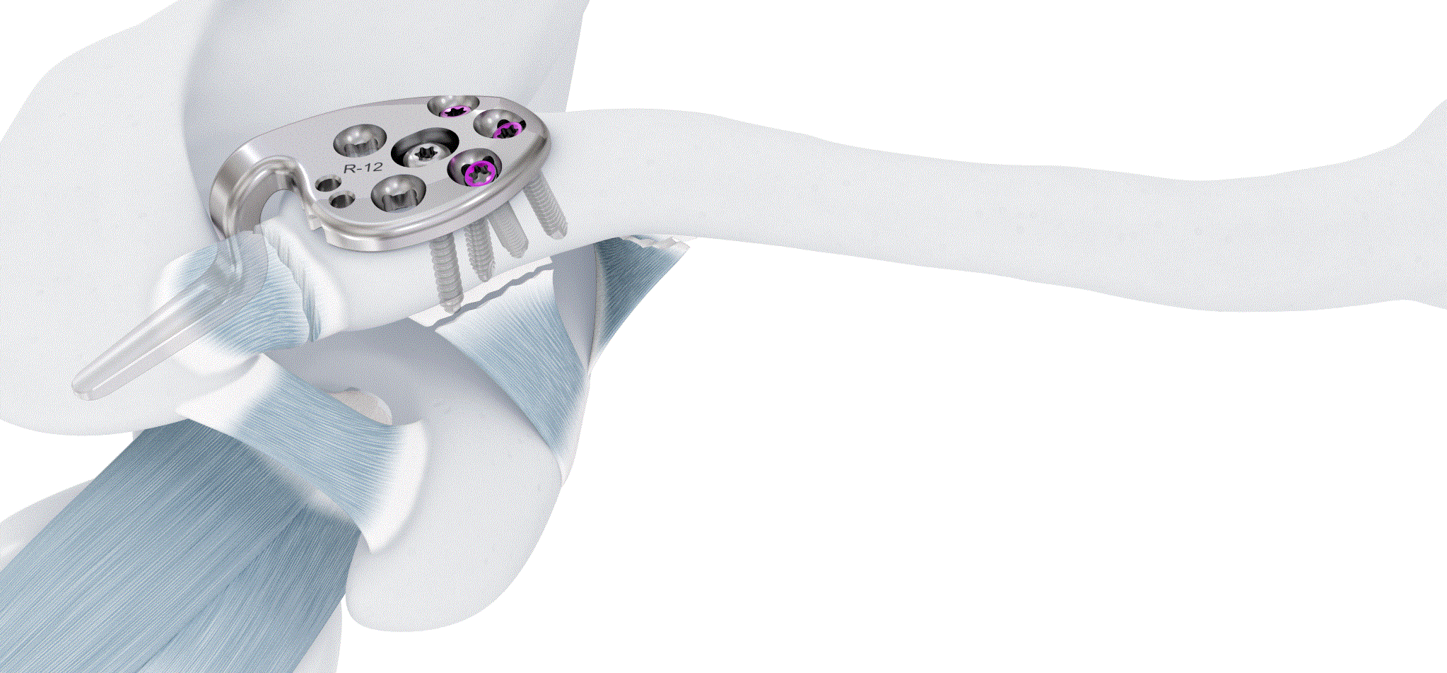 The VA-LCP Clavicle Button Hook Plate 2.7 is the smallest hook plate on the market and has been specifically designed for the treatment of acromioclavicular joint separations. The shortened and rounded plate body allows the hook to be targeted at the optimal contact location under the acromion with minimal incision size (Fig 8). The 2.7 mm single screw (as seen in the VA-LCP Clavicle Plate 2.7 System) reduces system complexity and facilitates ease of surgical procedure.