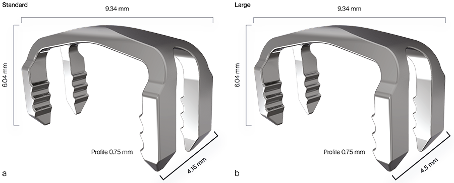 The DPS Hammertoe CCI has a staple-like design with four legs and a low profile connecting bridge (Fig 1). It is made of biocompatible Nitinol, a metal alloy of nickel and titanium, which is known for its superelastic properties and shape memory behavior.