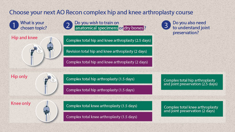 From the AO Recon Complex Hip and Knee Curriculum, we offer nine different course types with anatomical specimen or dry bones that cover all single or combined topics.