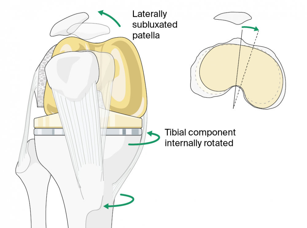 An internally rotated femoral component shifts the trochlear groove medially, thus increasing the distance to the patella, which tracks laterally relative to the femur. Through the tension exerted by the lateral retinaculum, the patella is pulled sideways. This may lead to patellar tilt, subluxation, or even dislocation [4].