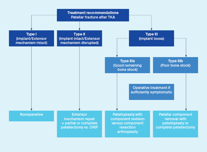 Periprosthetic patellar fractures associated with disruption of the extensor mechanism (type II) or loose prosthetic components (type III) should always be treated surgically. The same applies to fractures that are displaced for >2 mm, unless they are vertical, or comminuted with a prosthetic component that is still firmly fixed at the patellar button [20].
