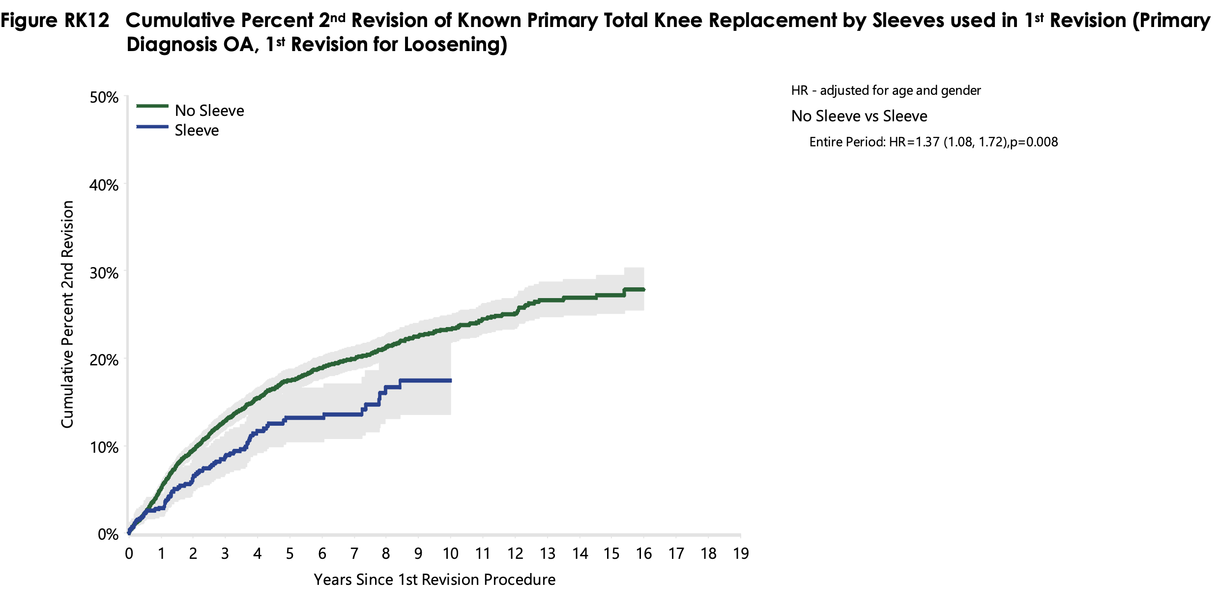 Large national joint arthroplasty registries in the UK and Australia report that the 10-year prosthetic survival rates of TKA revision surgery are around 20% [1, 2]. Nevertheless, the detailed analysis of survival rates is complex because the risk factors are manifold, and the use of sleeves and cones is just one of many variables. The National Joint Registry (NJR) of England, Wales, Northern Ireland, the Isle of Man, and the States of Guernsey [1] identified the time after primary knee replacement, type of primary fixation, type of revision prosthesis, as well as the indication for revision, as risk factors for re-revision. The Australian Orthopaedic Association National Joint Replacement Registry (AOANJRR) [2] identified diagnosis, components revised, gender, age, ASA score, as well as severe obesity, as risk factors. Additionally, they analyzed the effect on re-revision rates when supplementary implants, such as stem extensions, sleeves, or cones were used. Using stem extensions or sleeves (Figure 1) resulted in improved survival rates. No such difference was observed with cones (Figure 2). However, the low number of cones in the analysis is a major limitation to this data analysis: only 79 cones were included in the beginning, and this number dropped to 23 after 3 years, and 11 cones after 5 years. Note that these analyses did not factor in the type of bone defect present at the time of surgery, as this data was not available.